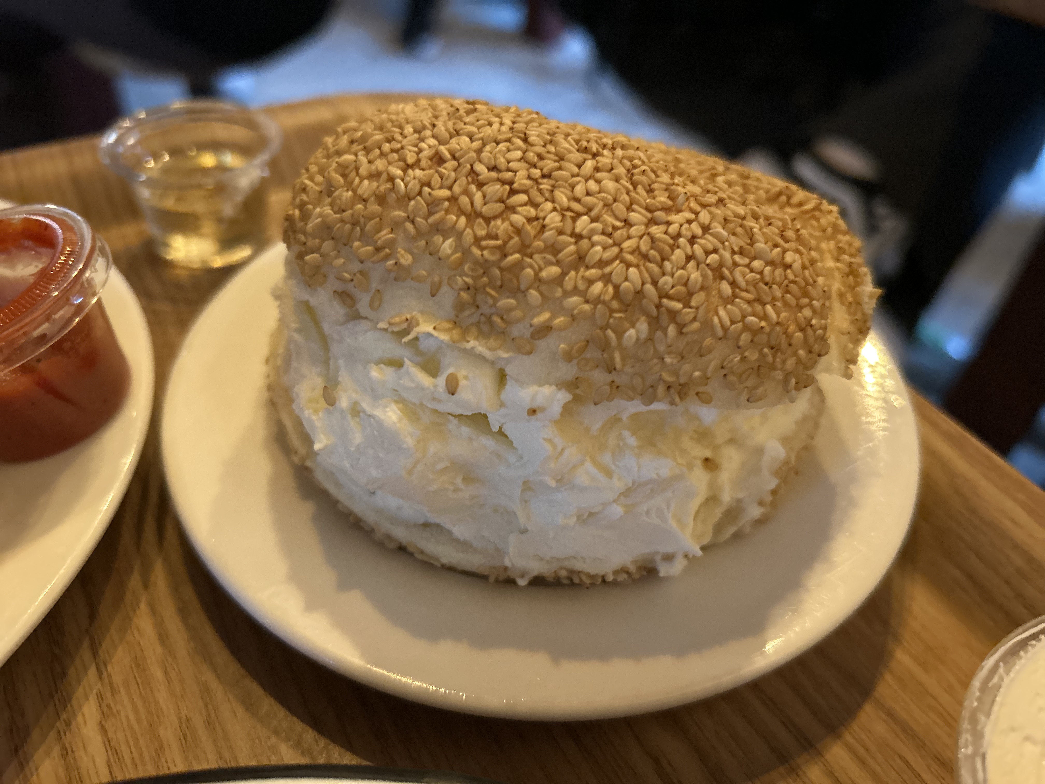 브릭레인, 가장 궁금했던 깨 베이글에 크림치즈 + 꿀 조합이 얼마나 고소할지 상상만큼 아니 그것보다 더 맛있게 먹었다. 두개 먹어도 정말 맛있게 먹을것 같은 맛 ( 집에 포장해가서 순삭했다.) / 강추