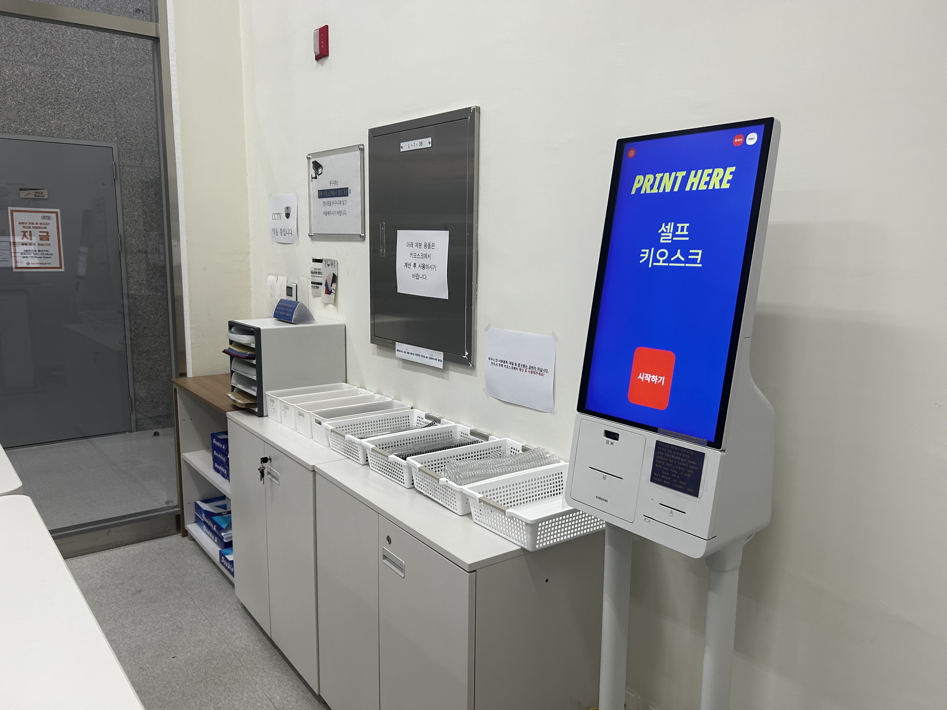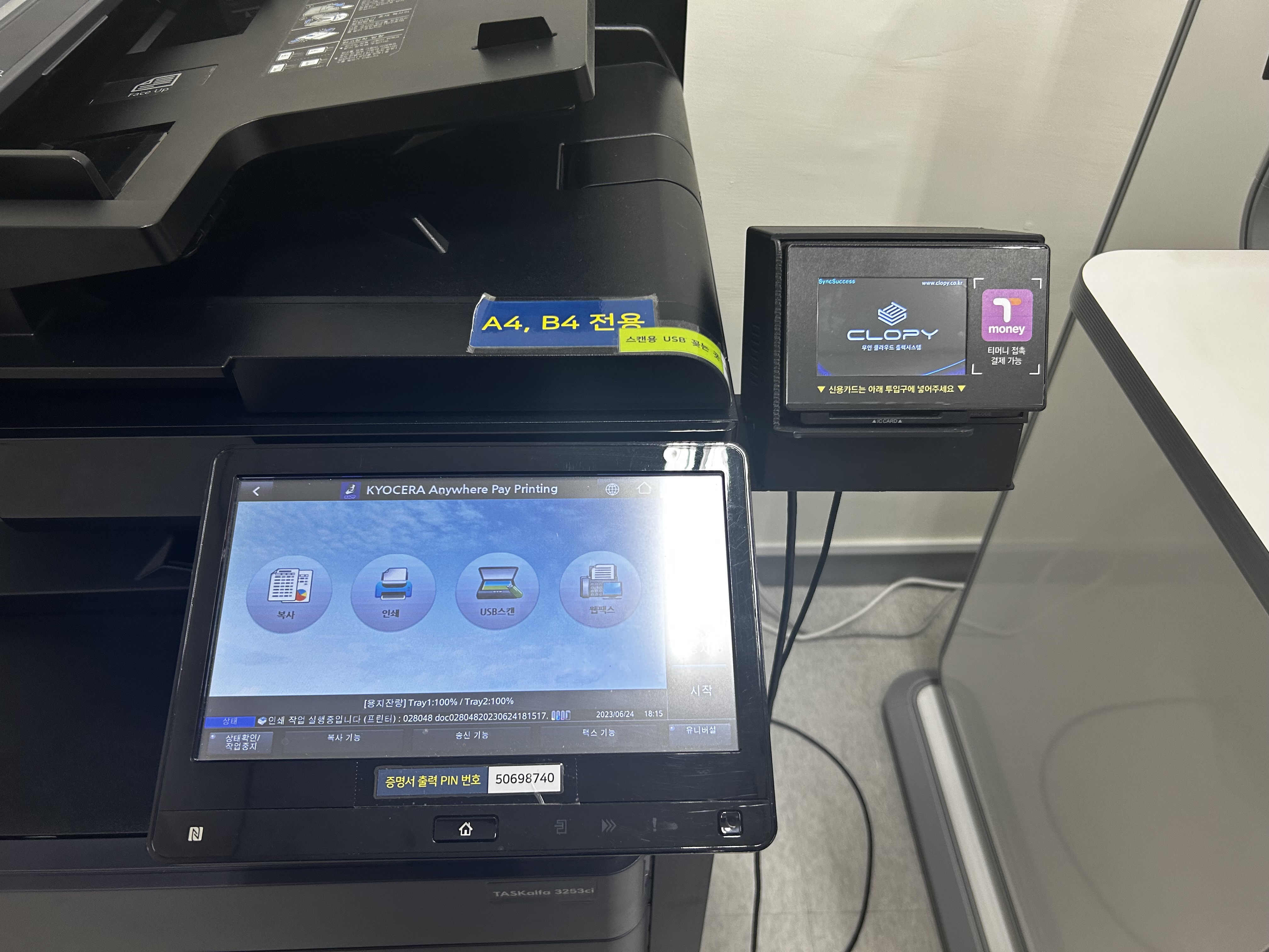 프린트물 출력 누르시면 결제를 하라고 뜨는데 그럼 프린트기 옆에 달린 카드리더기에 카드를 인식하시면 됩니다.
